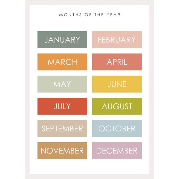 Dette levende plakat viser 'Årets Måneder' i et farverigt design, perfekt til at tilføje et strejf af glæde til ethvert rum. Med måneder fra januar til december i en pæn opstilling tjener det både som dekoration og et pædagogisk værktøj. Produktet indeholder kun én plakat.