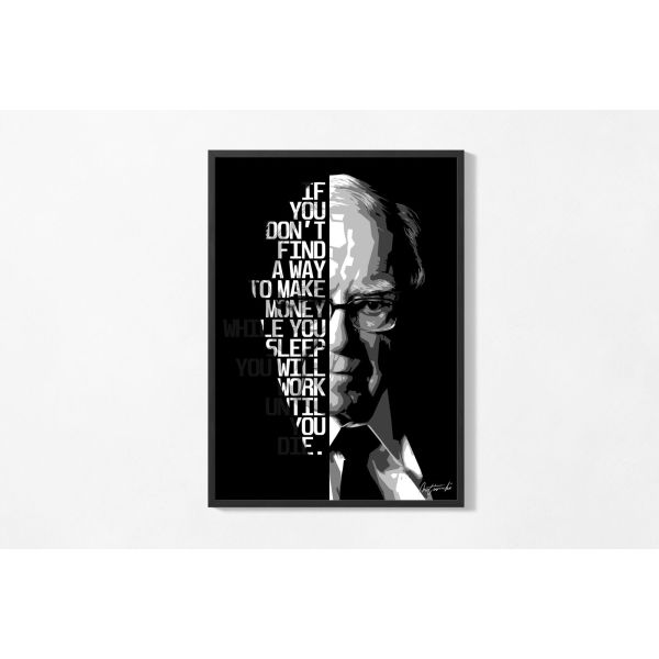 Denne slående plakat har et inspirerende citat: 'If you don't find a way to make money while you sleep, you will work until you die.' Kunstværket inkluderer et portræt i gråtoner og giver en stærk visuel effekt. Perfekt til motivation i private eller professionelle rum. Produktet indeholder kun en plakat.