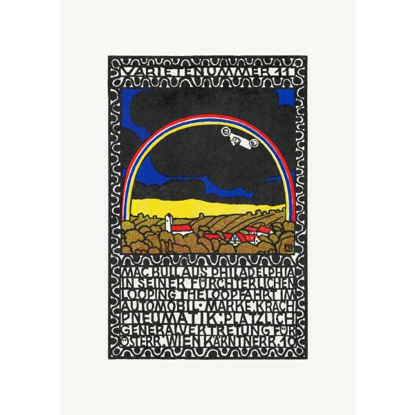 Denne iøjnefaldende plakat viser et levende landskab under en regnbue med teksten: 'Macbull aus Philadelphia in seiner furchterlichen Looping the Loop'. Skabt i en fed og farverig stil, vækker den en følelse af energi og nysgerrighed. Produktet indeholder kun en enkelt plakat.