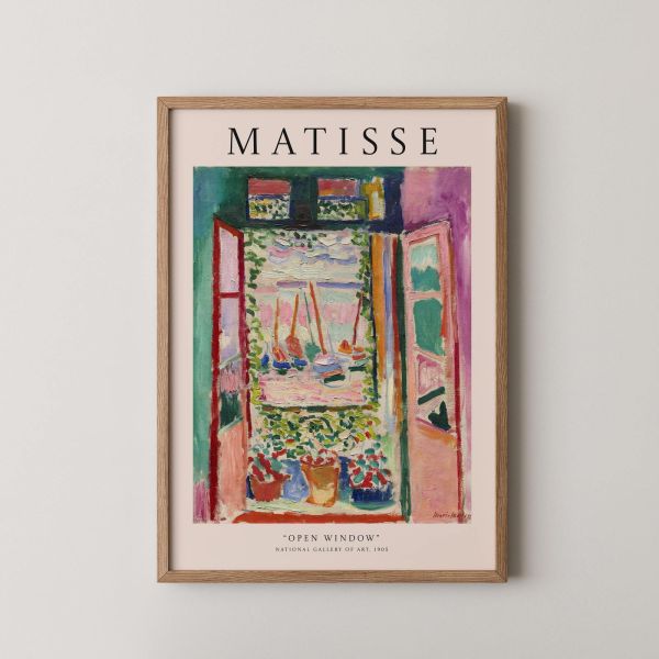 Denne Poster med det livlige kunstværk 'Åbent Vindue' af Henri Matisse bringer liv og farver til ethvert rum. Oprindelig malet i 1905, er det en del af National Gallery of Arts samling. 'MATISSE' og 'ÅBENT VINDUE' er fremtrædende. Dette produkt indeholder kun en enkelt poster.